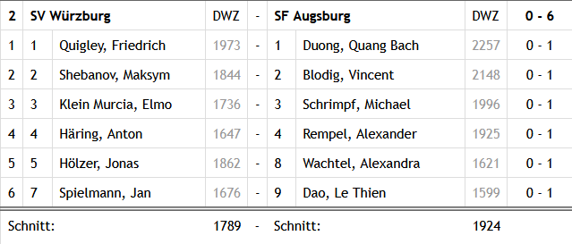Mit dem klaren 6:0 gelang uns ein optimaler Start in die Saison, auch wenn Tarrasch München ebenfalls einen hohen Sieg einfuhr. In drei Wochen warten mit Noris Tarrasch Nürnberg und Erlangen zwei Mannschaften aus dem oberen Leistungsbereich – ein erster echter Gradmesser für unser junges Team.