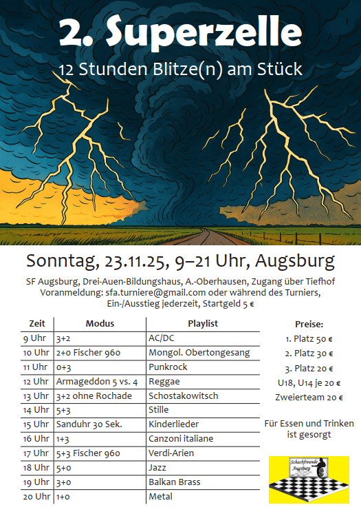 Für Sonntag, den 23. November, sind schwere Gewitter über Augsburg-Oberhausen angesagt. Eine Superzelle wird über dem Stadtteil stehen und den ganzen Tag lang für ununterbrochenes Blitzen sorgen. Aber es braucht sich niemand zu ängstigen, denn mit (zuweilen) sanften Klängen aus der Musikanlage und einem Süppchen werden wir für freundliche Stimmung sorgen, wenn wir zwölf Stunden lang Blitzschach spielen.