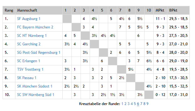 Die Ligasituation ist eindeutig – nachdem wir das Topspiel zwischen den Tabellenführenden gegen Garching (ein mustread!) knapp gewonnen haben, erreichten wir einen 2-Punkte-Vorsprung gegen die Mitstreiter um dem Aufstieg Noris-Tarrasch Nürnberg und FC Bayern München. Verlieren wir ein Spiel in den Runden 6-7, scheint die Ligaentscheidung durch Brettpunkte realistisch, sodass zu diesem Zeitpunkt wohl kaum eine andere Begegnung einen größeren Einfluss um den Aufstieg in die 2. Bundesliga haben wird.