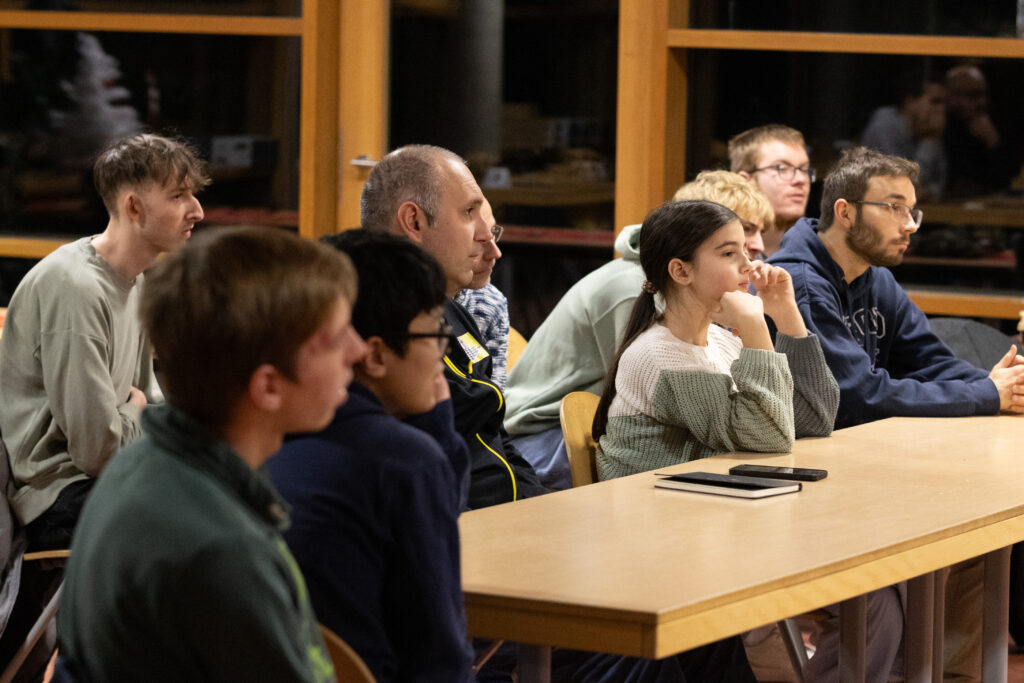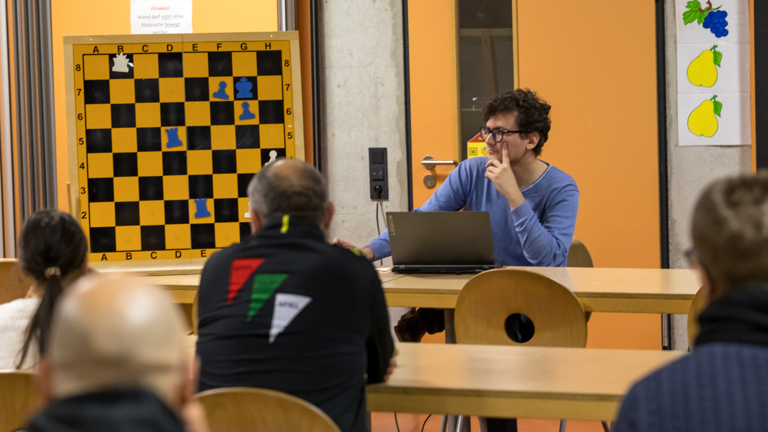 Etwa 15 Schachfreunde lauschten gebannt den Ausführungen und versuchten sich an Stellungseinschätzungen und Zugvorschlägen. Darunter waren einige Spieler aus den ersten beiden Mannschaften, etwa Uli, der sich wohl noch letzte Tricks für seinen großen Auftritt am kommenden Freitag erhoffte, aber auch aufstrebende Nachwuchskräfte wie Vasko.