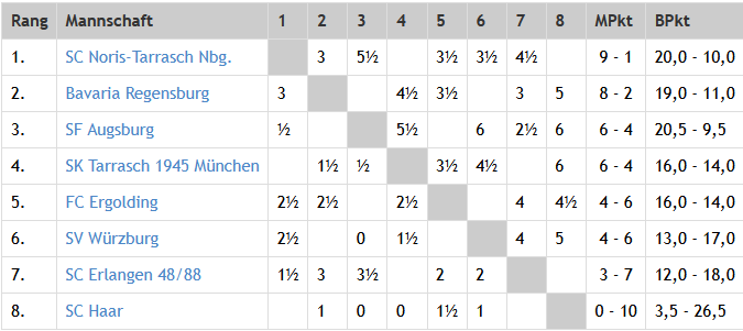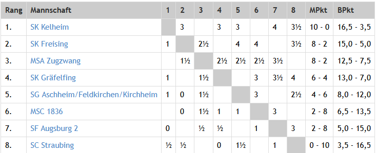 Mit diesem ersten Saisonsieg gab die Mannschaft die rote Laterne ab und verbesserte sich auf Tabellenplatz 7. Vielleicht geht ja am letzten Spieltag gegen den SK Freising oder SG Aschheim/Feldkirchen/Kirchheim noch was…
