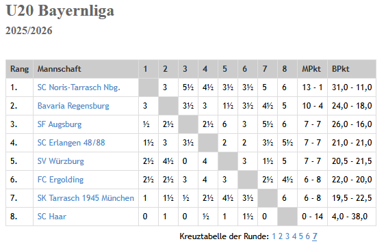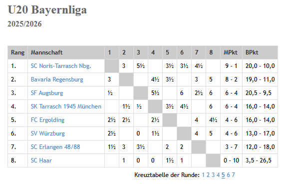 Insgesamt hatten wir als U20-Mannschaft eine durchwachsene Saison – zum Start waren wir gemeinsam mit Nürnberg und Regensburg einer der Mitfavoriten auf die Top-2-Platzierung – jedoch ist bei einer Niederlage gegen beide, sowie zusätzliche Niederlage gegen Erlangen keine Teilnahme an der DVM zu erwarten. Mit 7 aus 14 Mannschaftspunkten, können wir uns über dem dritten Platz, sowie den im Nachhinein gesicherten Klassenerhalt in Runde 6 gegen Ergolding freuen, im nächsten Jahr eine weitere Chance zu nutzen.