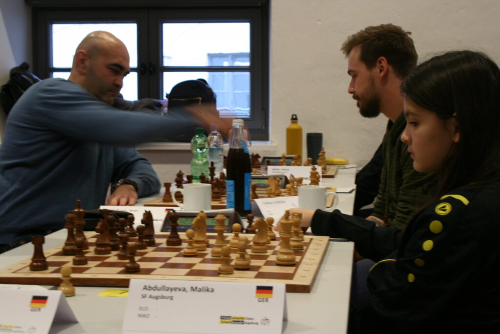 Sofija war eine der Schachfreunde, die erst zum Ende des Turniers hin aufdrehten. Das ist verständlich, denn sie hatte ausschließlich Gegner mit deutlich vierstelliger Wertungszahl. Zwei davon brachte sie zur Strecke, einmal remisierte sie – eine erstaunliche Leistung! Kevins poetische Schilderung ihrer Taktik in der Schlussrunde soll hier noch einmal ungekürzt wiedergegeben werden: „Kyryl Yarmish schlug mit seiner Dame unbedarft den scheinbar hängenden weißen Springer auf d4. Seine junge Gegnerin Sofija Isaković von den Schachfreunden Augsburg griff daraufhin sofort mit Lxh7+ zu und demaskierte ihre eigene Königin, die nun im nächsten Zug auf d4 erscheinen wird.“