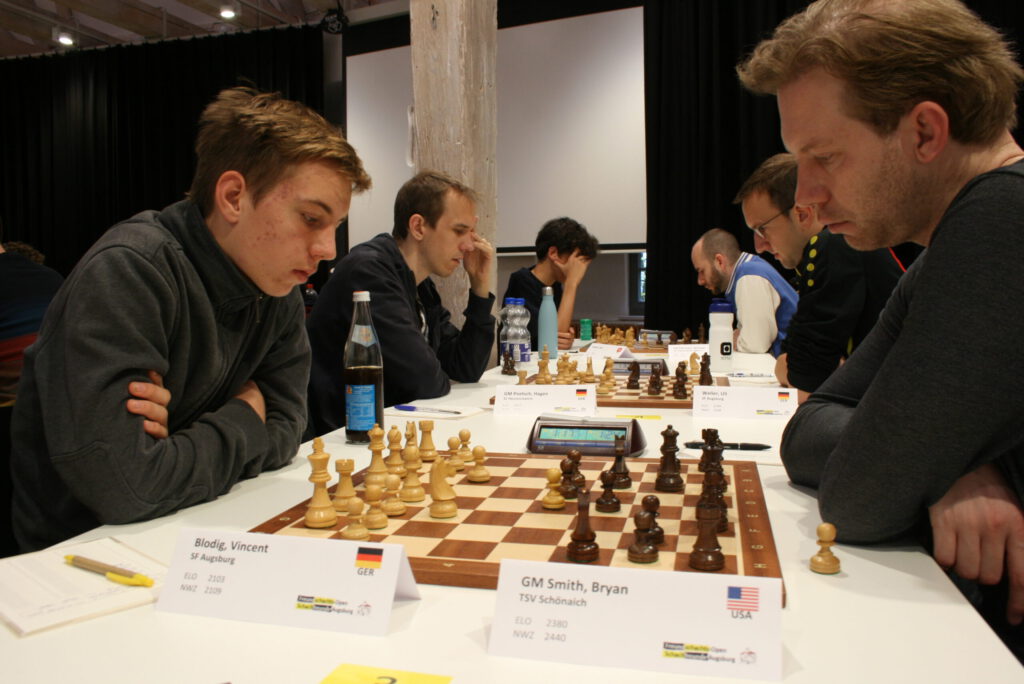 Mit Vincent und Uli erreichten zwei weitere Schachfreunde 5,5 Punkte. Vincent schaffte es in einem hervorragenden Turnier mit dem 7. Platz in die Preisränge. Dabei ließ er sich nur von zwei Großmeistern stoppen; die fünf Partien, in denen er favorisiert war, gewann er sämtlich. In der dritten Runde traf auch er auf GM Smith, mit den weißen Steinen. In einem Vorstoßfranzosen mit entgegengesetzten Rochaden entwickelte sich eine scharfe „Kampfpartie“, in der beide länger in Zeitnot kamen. Die Stellung war unübersichtlich, Vincent hatte phasenweise zwei Mehrbauern, war aber doch nur nahe am Ausgleich und in die Verteidigung gedrängt. Durch ein „taktisches Versehen“ in der Endphase der Partie unterlag Vincent nach einer großen Leistung noch. In der Schlussrunde remisierte Vincent souverän und ohne große Probleme gegen GM Poetsch. Ein tolles Turnier von Vincent!