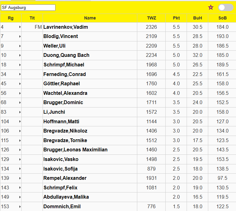 Durchweg Gegner, die bezogen auf sein eigenes Rating stark waren, hatte Nikoloz. Hier holte er sehr respektable 2,5/6, bei einem Bye. In der Schlussrunde remisierte er gegen einen Stammspieler aus der Schwabenliga 1, Wolfgang Koelbl (SK Klosterlechfeld). Ein starkes Turnier von Nikoloz!